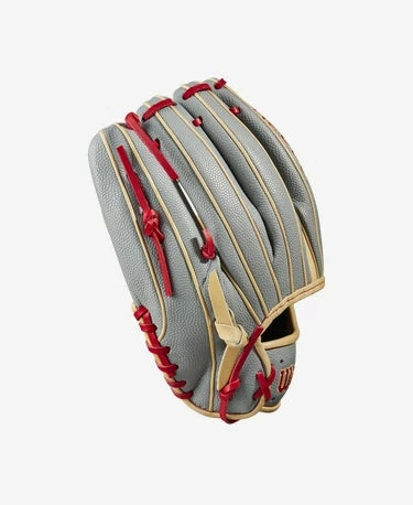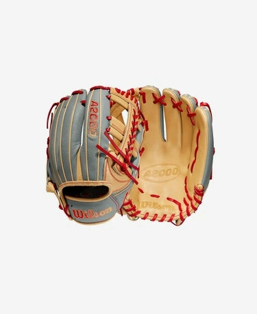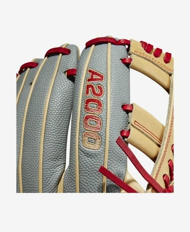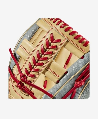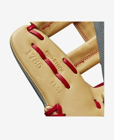 Stitch up holes in the infield defense with the A2000® 1785SS, the baseball glove with a Blonde cross web and red lace baseball stitching to snatch line drives and ground balls. The Blonde Pro Stock® leather palm features a gap welting – a piece of the palm folded between the index and middle fingers – allowing for a deep, stable pocket. The glove’s Grey SuperSkin™ back reduces weight while improving durability, and gradient Bold Logos in Red and Blonde add to the modern look. At 11.75”, the A2000 1785SS offers the reach and control to make backhand plays at third or turn two up the middle.