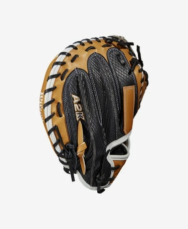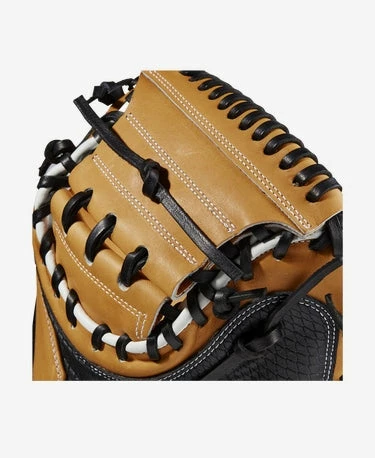 Full stop. Featuring an extended palm and deep pocket, the A2K® M1DSS 33.5” catcher’s mitt is designed to reduce rebound. The Vintage Tan Pro Stock® Select leather palm pairs with a lightweight Black SuperSnakeSkin™ back to form the ultimate companion behind the plate. White accents and Black laces deliver long-lasting style, and the SuperSnakeSkin back cuts glove weight to help catchers frame every pitch on the corner of the plate.